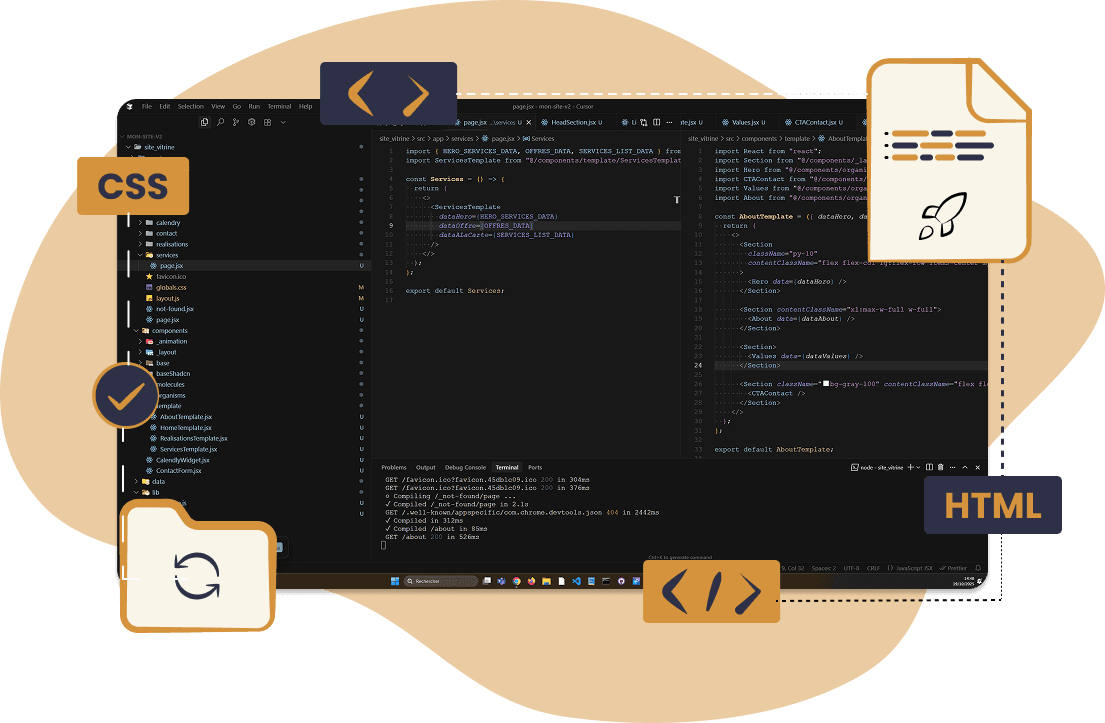 Si le graphisme m'a attiré, c'est le développement qui a été la véritable révélation. J'y ai trouvé la rigueur technique et la logique fascinante dont tout projet a besoin. Le code n'est pas seulement un langage, c'est la structure qui garantit la performance sans faille et la fiabilité de votre plateforme. En maîtrisant cette logique, je transforme le beau design en une expérience utilisateur (UX) solide et durable.